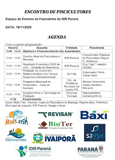 Produtores rurais da região terão a oportunidade de participar do Encontro Regional de Piscicultura durante o último dia da 21ª EXPOVALE, evento agropecuário e industrial que movimenta o município e atrai público de toda a região. A atividade acontece no dia 19 de novembro, às 13h30, no Espaço de Eventos da Fazendinha do IDR-Paraná, oferecendo conhecimento técnico e atualização sobre uma das atividades que mais cresce como alternativa de renda e diversificação nas propriedades rurais. A programação contará com abertura oficial, seguida de palestras sobre o cenário atual da piscicultura e mercado, resultado econômico 2025 da Unidade de Referência, produção de juvenil em sistema biofloco, programa municipal de piscicultura como caso de sucesso e apresentação de equipamentos e tecnologias de produção. Entre os palestrantes estarão o coordenador estadual de piscicultura Miguel C. Antonucci, o Engenheiro Agrônomo Leandro Cividini, o empresário Flávio César Urizzi, o médico veterinário Carlos Hamilton Menarim e representantes comerciais da Trevisan. As inscrições devem ser feitas pelo site (http://www.idrparana.pr.gov.br). O Encontro Regional de Piscicultura integra a programação da EXPOVALE 2025, que reúne atrações, tecnologia, negócios e shows nacionais, consolidando-se como um dos grandes eventos do calendário agrícola do Paraná.