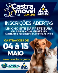 Prefeitura de Cambira inicia cadastro para programa de Castração da AMUVI 23 de fevereiro de 2026 Ler notícia
