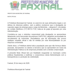 Golpista que agiu recentemente em Jardim Alegre tenta aplicar o golpe da “Vaga de Emprego” em Faxinal 26 de março de 2026 Ler notícia
