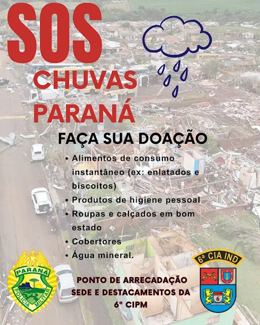 A 6ª Companhia Independente de Polícia Militar (6ª CIPM) de Ivaiporã iniciou uma campanha solidária para arrecadar donativos em apoio às famílias atingidas pelo tornado e pelas fortes chuvas que devastaram várias cidades do Paraná, especialmente Rio Bonito do Iguaçu e Guarapuava. A ação faz parte da mobilização estadual “SOS Chuvas Paraná”, que reúne forças de segurança e órgãos públicos em prol das vítimas.  Além da sede da 6ª Companhia, moradores dos 14 municípios atendidos pela unidade também podem deixar suas doações diretamente nos destacamentos da Polícia Militar de suas cidades. Estão sendo arrecadados alimentos de consumo instantâneo (como enlatados e biscoitos), produtos de higiene pessoal, roupas e calçados em bom estado, cobertores e água mineral. Os donativos serão destinados às comunidades afetadas, onde centenas de famílias perderam casas, bens e meios de sustento. Hospitais da região de Laranjeiras do Sul, Guarapuava e Cascavel seguem mobilizados no atendimento às vítimas. O Governo do Estado confirmou seis mortes em decorrência das tempestades — cinco em Rio Bonito do Iguaçu e uma na zona rural de Guarapuava. Entre as vítimas estão três homens (49, 57 e 83 anos) e duas mulheres (14 e 47 anos) de Rio Bonito do Iguaçu, além de um homem de 53 anos de Guarapuava. Há ainda uma pessoa desaparecida.  A Polícia Militar reforça o apelo à solidariedade da população do Vale do Ivaí, destacando que cada contribuição pode fazer a diferença neste momento de grande necessidade.