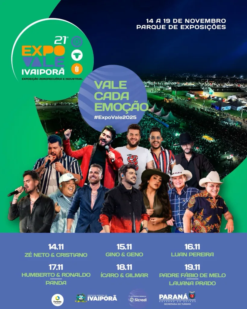 Nesta sexta-feira, 14 de novembro de 2025, foi realizada a abertura oficial da Expovale, em Ivaiporã, e nossa equipe de reportagem, do Blog do Berimbau e da Rádio Nova Era FM, acompanhou o evento que ocorreu por volta das 17h em frente ao portão principal do Parque de Exposições. A solenidade contou com a presença do ex-governador Orlando Pessuti, representando o governador Ratinho Junior, dos deputados estaduais Ademar Traiano e Alexandre Cury sendo o último presidente da Assembleia Legislativa —, do deputado federal Sérgio Souza, além do prefeito Carlos Gil, da vice-prefeita e coordenadora do evento, Gertrudes Bernardy, vereadores e prefeitos da região: Entre eles: Moisés de Jardim Alegre, Adilson Lucchetti de Borrazópolis, Rildo de São Pedro do Ivaí e Hermes Santa Rosa de Faxinal. Durante os pronunciamentos, as autoridades elogiaram a gestão de Carlos Gil, com Alexandre Cury afirmando que todas as cidades do Brasil gostariam de ter um prefeito com este nível, responsável pela construção do parque, pela realização da grande festa e com obras históricas; Sérgio Souza destacou que, em apenas dois ou três anos de organização, a Expovale já não deve nada a grandes centros como Maringá e Londrina; e Pessuti relembrou a trajetória dos eventos de Ivaiporã até chegar ao atual formato da Expovale. O prefeito Carlos Gil e Gertrudes Bernardy enfatizaram os investimentos realizados para esta edição, como ampliação do estacionamento, reforço no abastecimento de água, melhorias nos barracões e aperfeiçoamento da estrutura geral. Após os discursos, os portões foram abertos oficialmente ao público, e a primeira grande atração musical da festa foi o show de Zé Neto & Cristiano, marcando uma abertura especial de mais uma edição da Expovale. Quanto os cantores entraram no palco, uma multidão de fãs aguardava. Mesmo sendo numa sexta-feira, arena ficou lotada, revelando o sucesso de mais uma edição do evento. SOLIDARIEDADE – Durante abertura, o prefeito anunciou que, no dia 19 de novembro, dia do show do Padre Fábio de Melo, a entrada será um quilo de alimento, e que, parte da arrecadação, será destinada as famílias de Rio Bonito do Iguaçu, cidade devastada por um tornado.