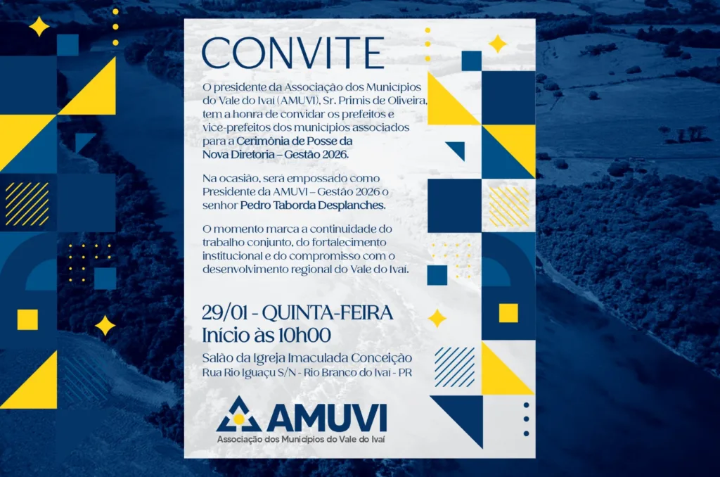 A Associação dos Municípios do Vale do Ivaí (AMUVI) realizará, na próxima quinta-feira, 29 de janeiro de 2026, a Cerimônia de Posse da Nova Diretoria – Gestão 2026. O evento acontecerá às 10h30, no Salão da Igreja Imaculada Conceição, em Rio Branco do Ivaí.
