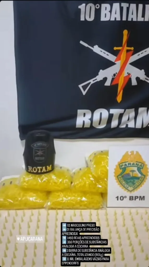 No local, também foram encontrados uma balança de precisão, R$ 1.460 em dinheiro e 11 pacotes contendo mil embalagens vazias cada. O homem assumiu a propriedade dos itens ilícitos, recebeu voz de prisão e foi encaminhado, junto com todo o material apreendido, para a 17ª Subdivisão Policial (SDP) de Apucarana.