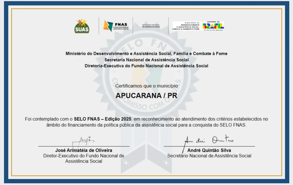 Esta é a primeira edição do Selo FNAS. A conquista posiciona Apucarana como referência na gestão da Assistência Social, reafirmando o cuidado com a população, a responsabilidade na gestão pública e a busca permanente por serviços cada vez mais eficientes.