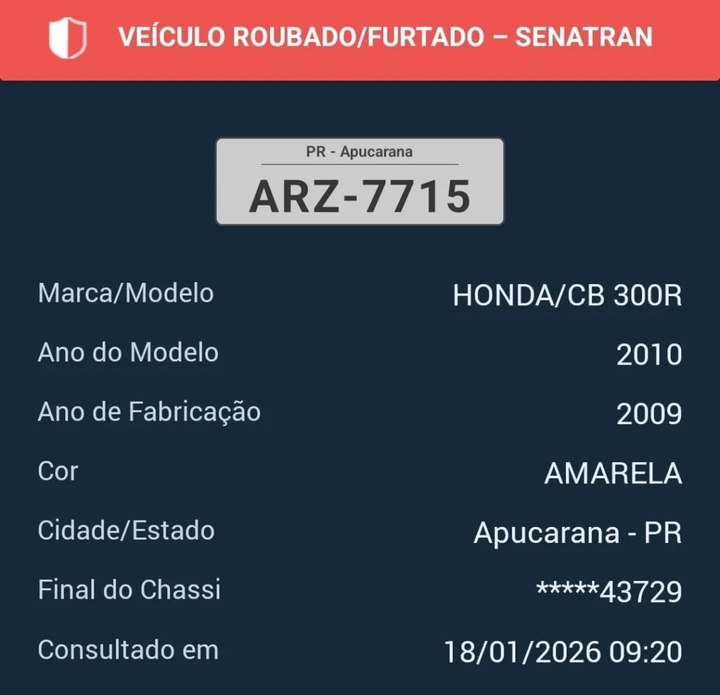 FURTO – Um furto qualificado foi registrado pela Polícia Militar na madrugada de domingo, 18 de janeiro de 2026, por volta das 4h10, em Apucarana. A equipe foi acionada pelo 190 para atendimento na Rua dos Agricultores, no Loteamento Residencial Orlando Bacarin. No local, os policiais fizeram contato com a vítima, Leandro de Jesus, de 41 anos, que relatou que por volta das 2h20 da manhã um indivíduo vestindo camiseta branca e calça jeans entrou em sua residência e furtou uma motocicleta. O veículo levado é uma Honda/CB 300R, de cor dourada, placa ARZ-7715. Após o relato, a equipe realizou patrulhamento pelos arredores, porém, até o momento do registro, a motocicleta não havia sido localizada. A vítima permaneceu no local e foi orientada quanto aos procedimentos cabíveis. O boletim de ocorrência foi confeccionado e o caso segue para investigação.