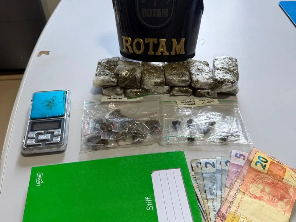 Questionado, o homem confirmou que havia mais drogas no interior da residência. Em buscas no imóvel, a equipe localizou outras porções de maconha, porções de haxixe do tipo “ice”, além de uma balança de precisão e um caderno com anotações relacionadas à comercialização.