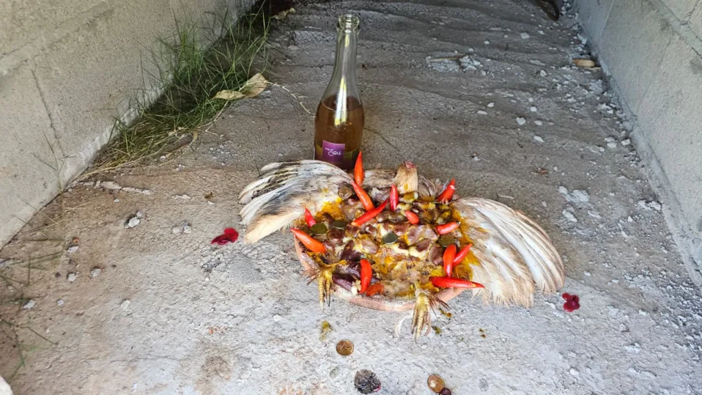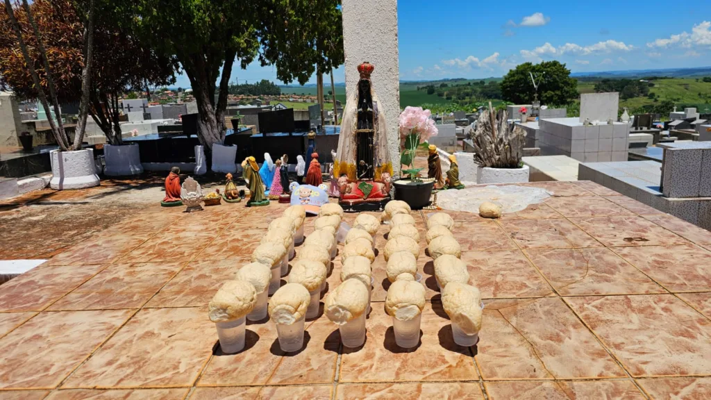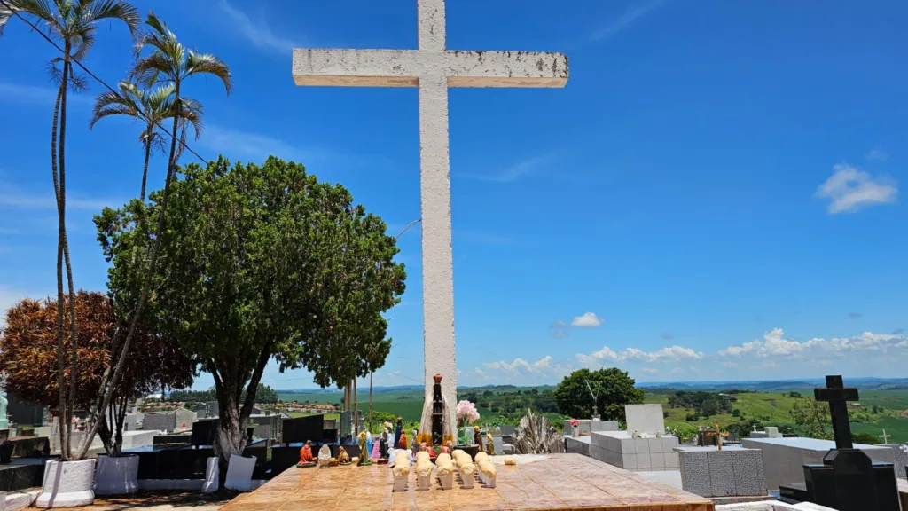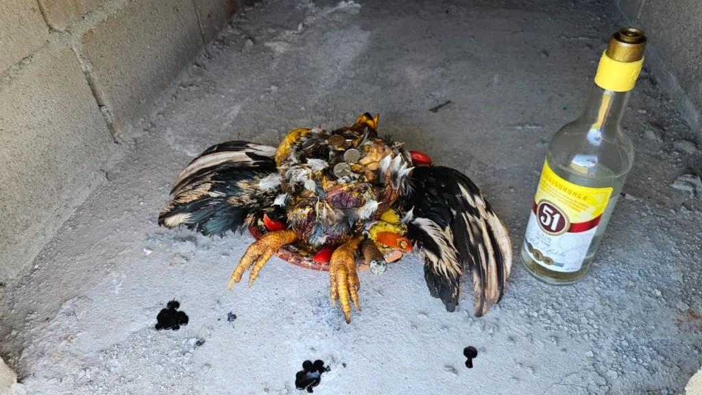 Ao adentrar o cemitério, seguindo em linha reta e passando pelo cruzeiro, a situação se torna ainda mais preocupante. No fundo do cemitério, em um túmulo que está em construção, com várias gavetas abertas, foram encontradas, dentro de cada gaveta, um litro de pinga da marca 51, e galinhas mortas com penas dentro das gavetas.