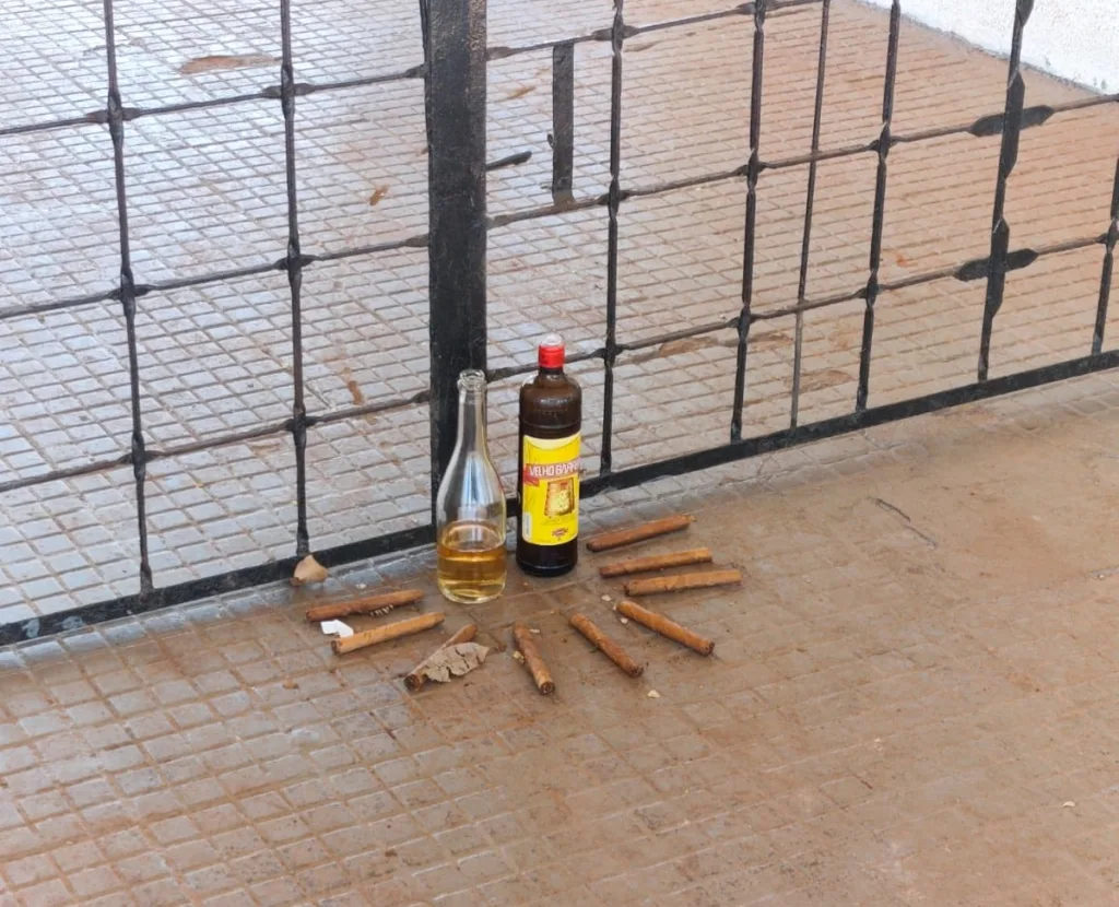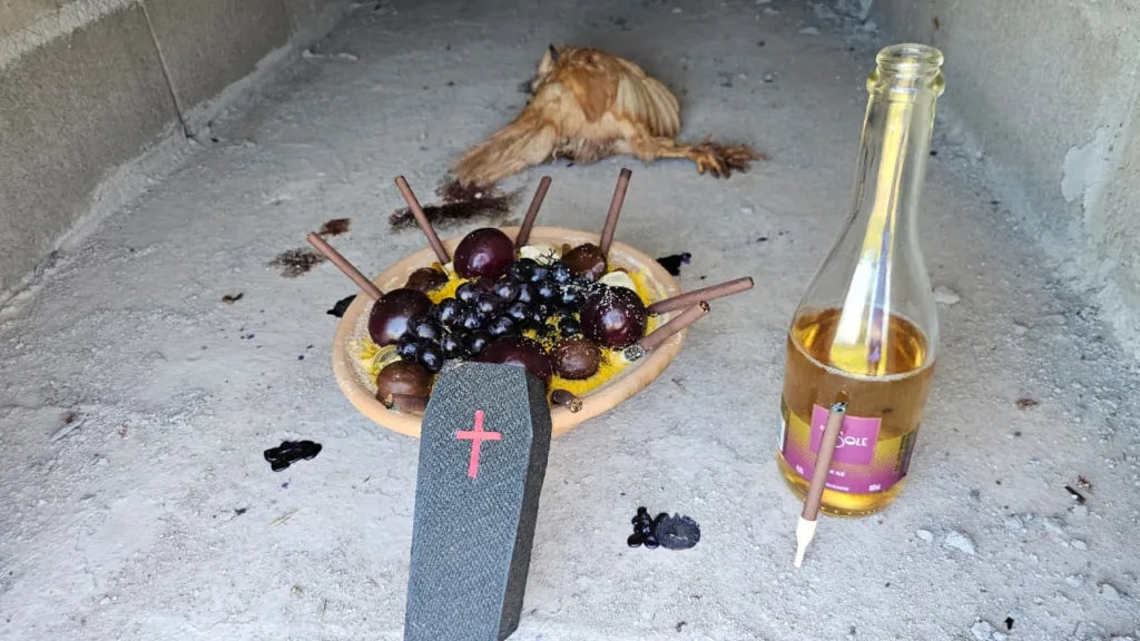 Logo na entrada do cemitério, quem chegou ao local pela manhã se deparou com um litro de bebida alcoólica da marca Velho Barreiro, e outro recipiente sem rótulo. Também havia charutos dispostos de forma organizada, formando um desenho no chão, bem em frente ao portão principal.