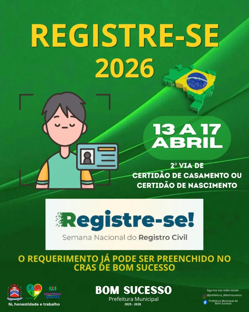 A Prefeitura de Bom Sucesso, por meio da Secretaria Municipal de Assistência Social, anunciou a participação do município no programa Registre-se! 2026, ação voltada à ampliação do acesso da população à documentação civil.
