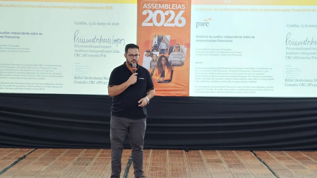 Durante a assembleia, foram apresentados os resultados financeiros referentes ao exercício de 2025, que fechou com um resultado de R$ 10,7 milhões, além das principais ações desenvolvidas ao longo do ano e as perspectivas para 2026. As apresentações foram conduzidas pelo gerente regional Ravely Coltre, pelo gerente da agência de Borrazópolis, Nelmar Pavão Gomes, e pelo presidente da Cresol Norte Paranaense, Claudomiro Garcia, que destacaram a importância da participação dos cooperados na construção dos resultados da instituição.