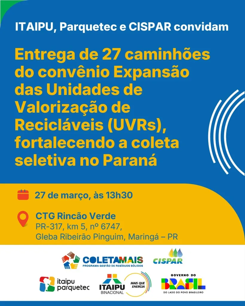O evento acontece às 13h30, no CTG Rincão Verde, e faz parte de um importante investimento voltado ao fortalecimento da coleta seletiva e da gestão de resíduos no Paraná.