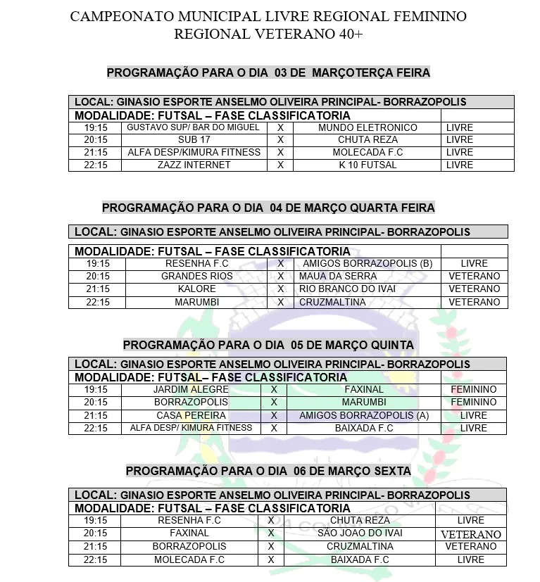 A Secretaria Municipal de Esportes, Lazer e Cultura de Borrazópolis divulgou a tabela da primeira rodada do Campeonato Municipal e Regional de Futsal. As partidas acontecem no Ginásio de Esportes Anselmo Oliveira, com início já na próxima semana, movimentando atletas do município e da região.