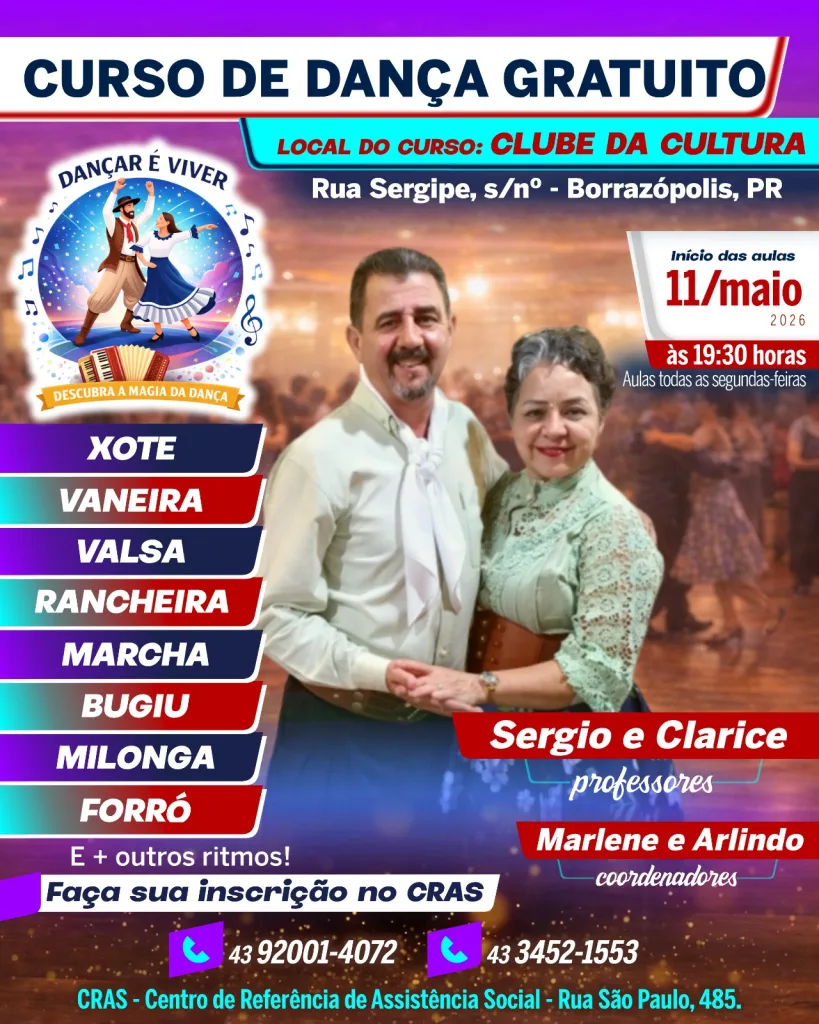 A Prefeitura de Borrazópolis informa que estão abertas as inscrições para um curso gratuito de dança, que será realizado no Clube da Cultura. A iniciativa busca incentivar a prática cultural e promover qualidade de vida à população.