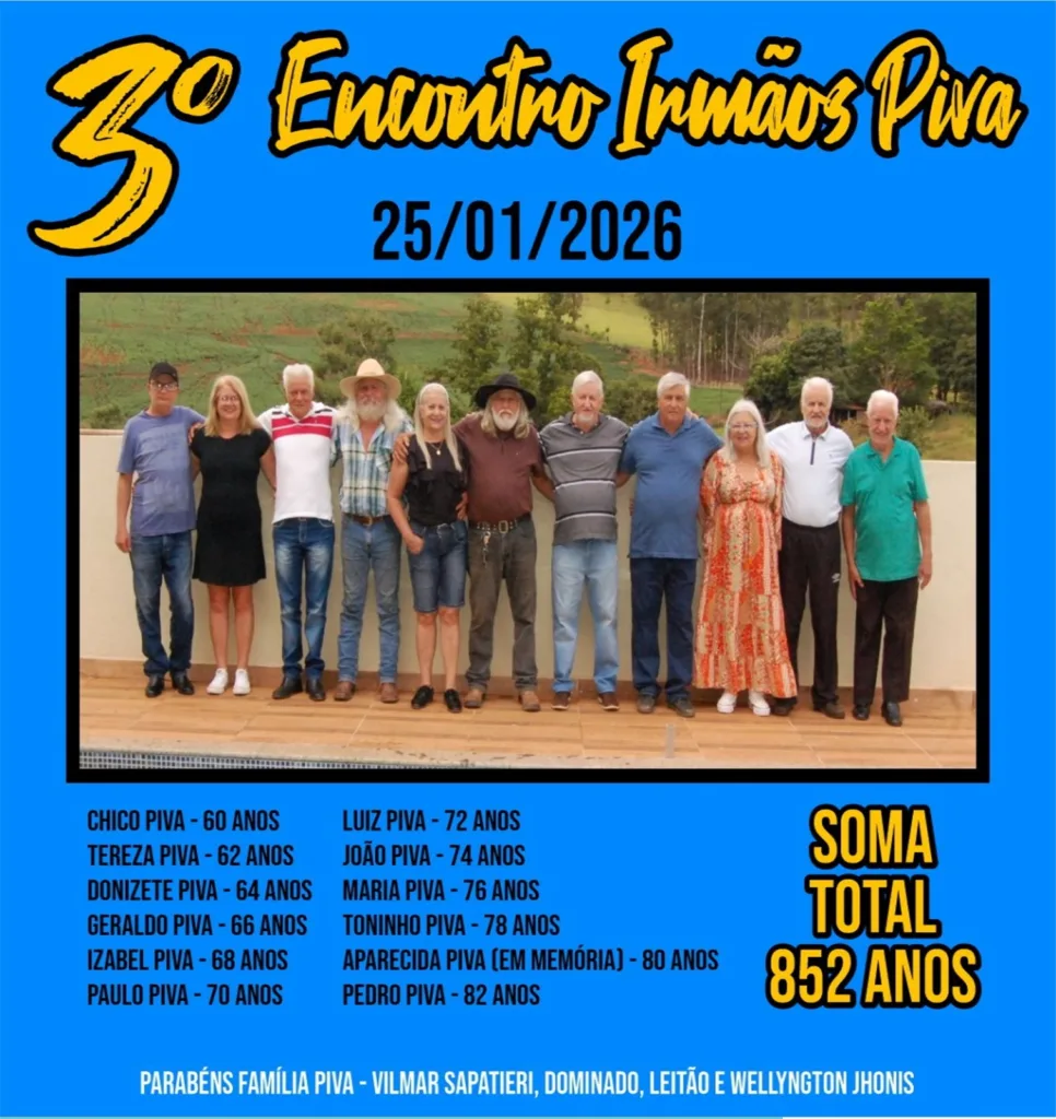 O encontro foi marcado por momentos de confraternização, recordações e gratidão, reunindo irmãos que carregam um legado construído ao longo de décadas. Também estavam noras, netos, agregados, demais familiares e alguns amigos. A família Piva faz parte da formação histórica de Borrazópolis, tendo contribuído de maneira significativa para o desenvolvimento social, político e econômico da cidade.