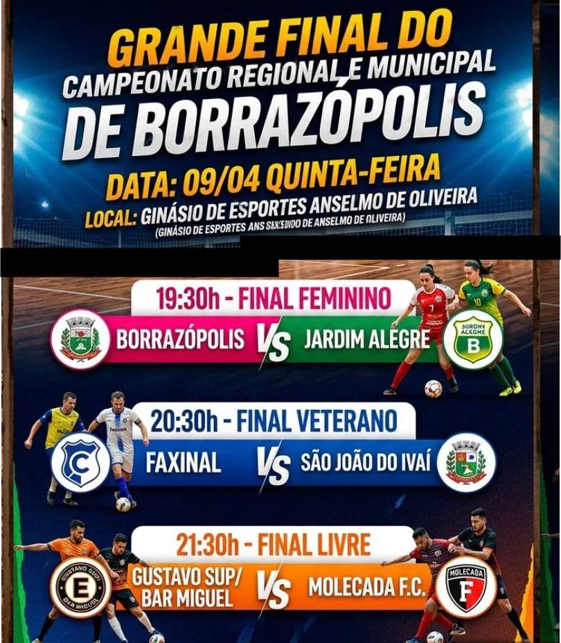 A noite será marcada por três decisões importantes, reunindo equipes da região em diferentes categorias. A programação começa às 19h30 com a final feminina entre Borrazópolis e Jardim Alegre. Na sequência, às 20h30, ocorre a final da categoria Veterano, com confronto entre Faxinal e São João do Ivaí.