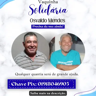 Uma campanha solidária foi lançada para ajudar o morador Osvaldo Mendes, que enfrenta um momento delicado de saúde. Segundo familiares, ele foi diagnosticado com câncer no estômago e iniciou o tratamento, que inclui consultas médicas frequentes e sessões de quimioterapia. Devido ao estado de saúde, Osvaldo precisou parar de trabalhar como pedreiro, o que comprometeu a principal fonte de renda da família. A situação tem dificultado o pagamento de despesas básicas e dos custos relacionados ao tratamento. “Estamos vivendo um momento de muita dificuldade. Pedimos a solidariedade das pessoas, pois qualquer ajuda faz diferença — seja para custear um remédio ou ajudar nas contas de casa”, relatou uma das filhas em nota. Quem quiser contribuir pode realizar doações via Pix para a chave 01918046905 (Conceição Alves de Souza Mendes). Além das doações financeiras, a família também pede o compartilhamento da campanha e orações por força e recuperação. Mais informações e o link para a publicação oficial estão disponíveis no Instagram: instagram.com/p/DQpwtvUkUgY.