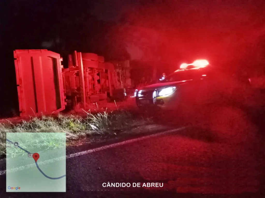 Um caminhão tombou na madrugada de quinta-feira, dia 05 de março, por volta de 2h30, na rodovia PR-239, no km 265 + 700 metros, no trecho entre os municípios de Cândido de Abreu e Reserva.