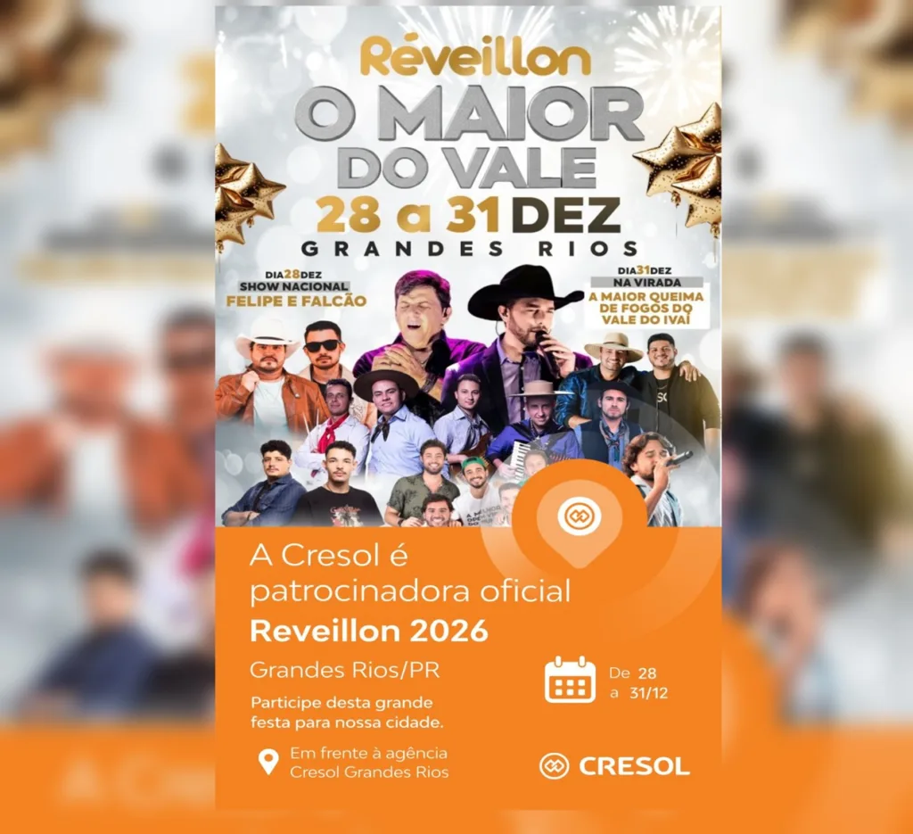 A Cresol é patrocinadora oficial do Réveillon 2026 – O Maior do Vale, que acontece entre os dias 28 e 31 de dezembro, em Grandes Rios (PR). O evento promete movimentar a cidade e toda a região com uma programação especial, reunindo grandes atrações musicais e uma das maiores queimas de fogos do Vale do Ivaí.