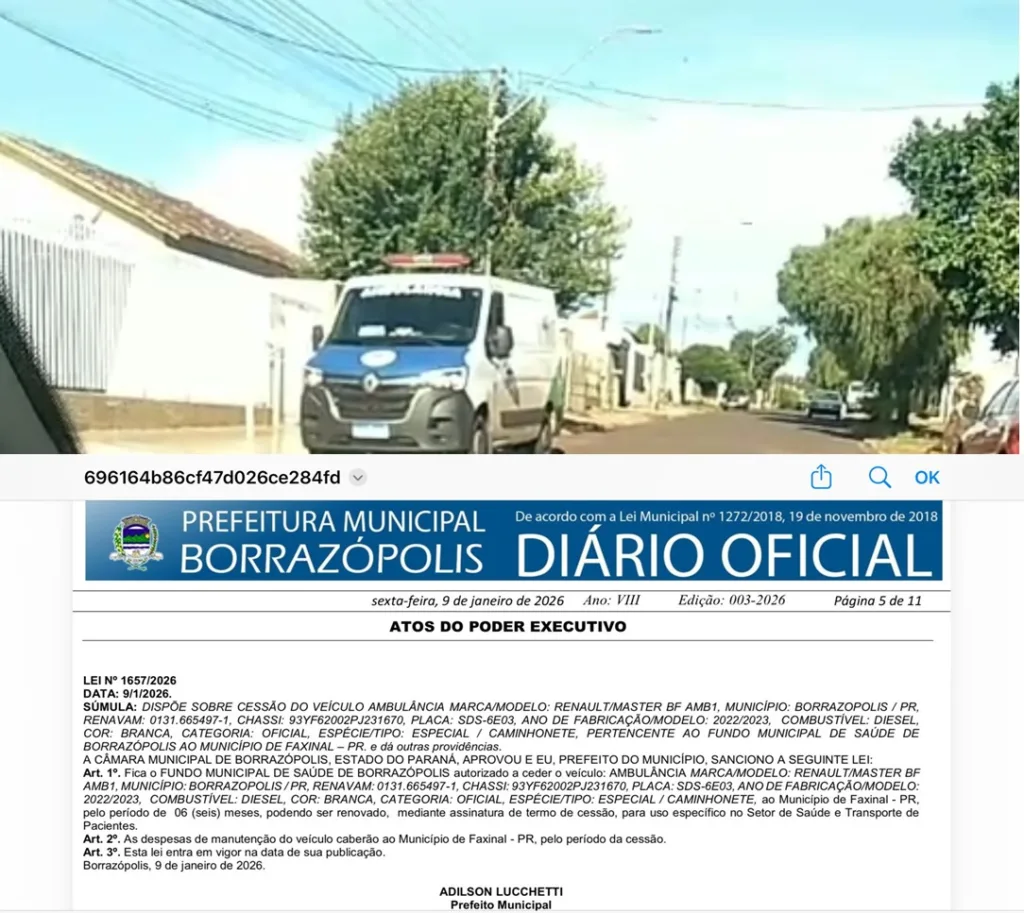 André Pereira encaminhou à reportagem documentação aprovada pela Câmara de Vereadores, autorizando a cessão temporária da ambulância para Faxinal. Ele ressaltou ainda que essa cooperação entre municípios é recíproca, lembrando que quando Borrazópolis precisou, Faxinal também já emprestou ambulância ao município.