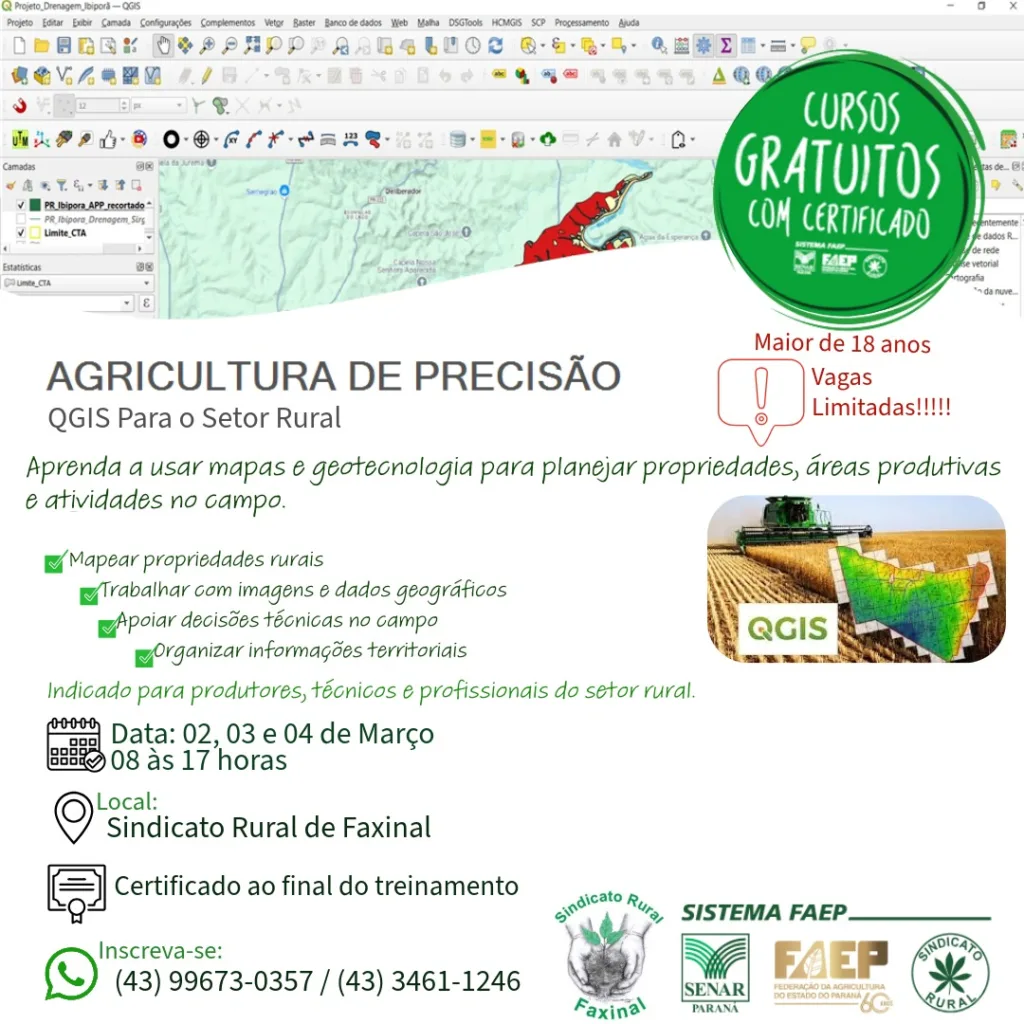 O curso de QGIS voltado ao setor rural é uma oportunidade para produtores, técnicos e profissionais que desejam aprimorar o uso de mapas digitais e dados geográficos no campo.