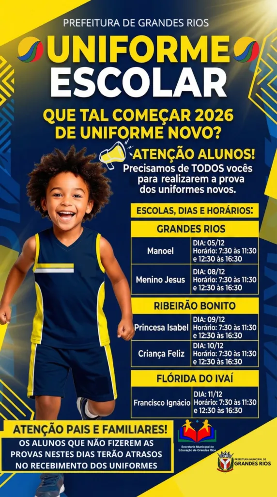 A Prefeitura de Grandes Rios, por meio do prefeito William José e da Secretaria Municipal de Educação, anuncia que já começou o processo de prova dos novos uniformes que serão entregues aos alunos no início do ano letivo de 2026. A participação dos estudantes é essencial para que todos recebam as peças no tamanho correto e sem atraso.