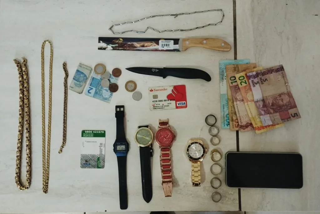 Entre os objetos recuperados estão três colares, uma pulseira e quatro relógios. Também foram apreendidos sete anéis, duas facas, dois cartões bancários e R$ 196,35 em dinheiro. Outros itens de origem duvidosa foram recolhidos para possível identificação de vítimas.