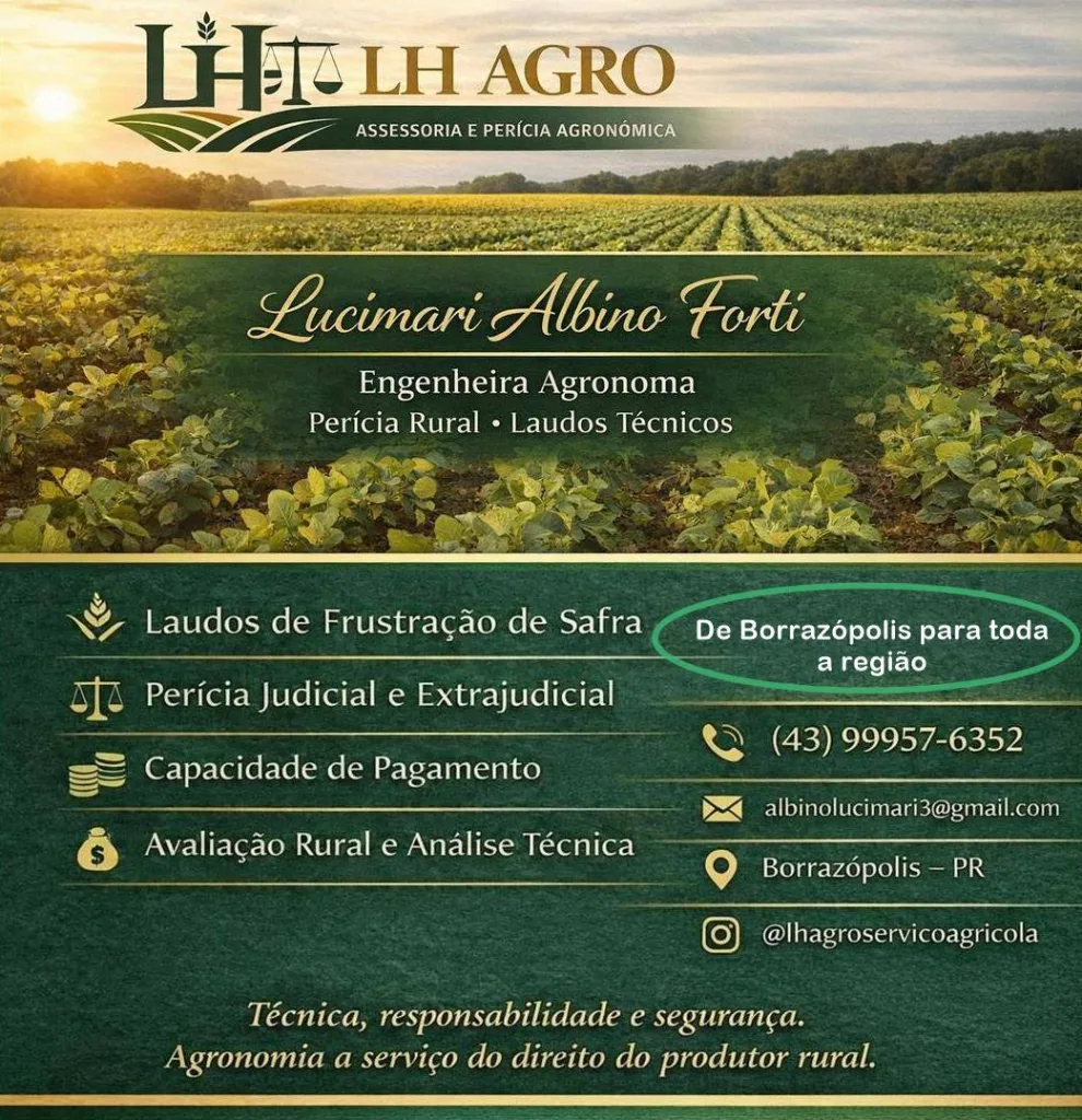 De Borrazópolis, atendendo toda região, você pode contar com uma empresa de assessoria e perícia agronômica que oferece suporte técnico especializado a produtores rurais que enfrentam dificuldades no campo. A LH Agro, comandada pela engenheira agrônoma Lucimari Albino Forti, atua diretamente na elaboração de laudos técnicos fundamentais para agricultores que tiveram perdas na lavoura.