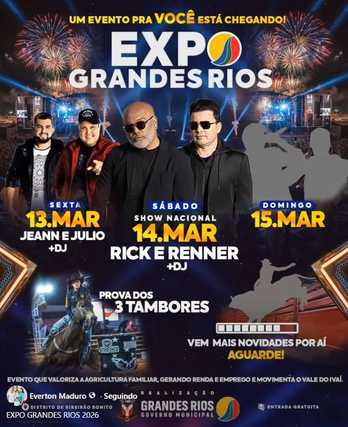 A apresentação promete reunir famílias, amigos e fãs do sertanejo em uma noite histórica para o município. A organização orienta que o público se programe e acompanhe os canais oficiais para mais novidades sobre a programação completa da Expo Grandes Rios 2026.
