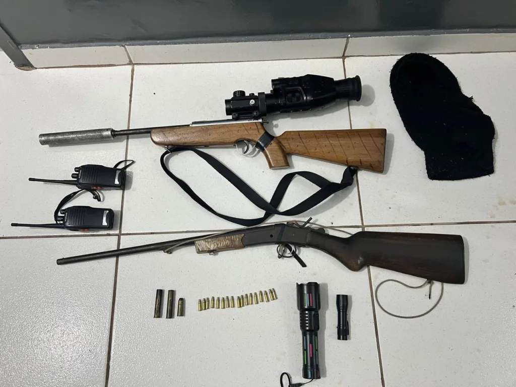Na ação, foram localizados um rifle calibre .22 com supressor de ruído e aparelho de visão noturna, além de uma espingarda calibre 36. Diante da situação, os dois homens adultos receberam voz de prisão por porte ilegal de arma de fogo e por adentrar em unidade de conservação portando instrumento de caça sem autorização.