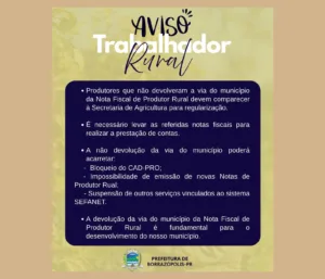 Prefeitura de Borrazópolis alerta produtores rurais sobre devolução da Nota Fiscal de Produtor Rural 27 de janeiro de 2026 Ler notícia