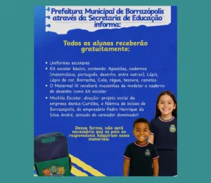 BORRAZÓPOLIS – Prefeitura anuncia entrega de uniformes, kits escolares e mochilas 13 de janeiro de 2026 Ler notícia