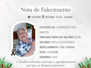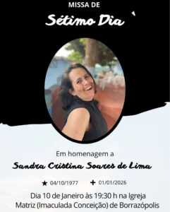 BORRAZÓPOLIS – Missa de sétimo dia de Sandra Cristina Soares de Lima será neste dia 10/01 10 de janeiro de 2026 Ler notícia