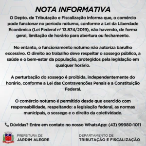 JARDIM ALEGRE – Prefeitura esclarece regras para funcionamento do comércio no período noturno 9 de janeiro de 2026 Ler notícia