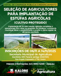 KALORÉ – Prefeitura abre seleção de agricultores para projeto de estufas agrícolas 7 de novembro de 2025 Ler notícia