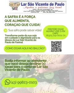 FAXINAL – Lar São Vicente de Paulo realiza campanha da soja e pede apoio da comunidade 20 de março de 2026 Ler notícia