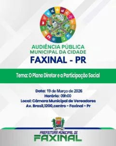 Prefeitura de Faxinal convoca população para audiência pública sobre atualização do Plano Diretor 3 de março de 2026 Ler notícia