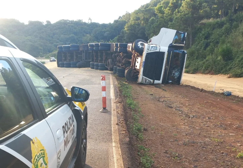 PITANGA – Acidente envolvendo caminhões provoca tombamento na PR-466
