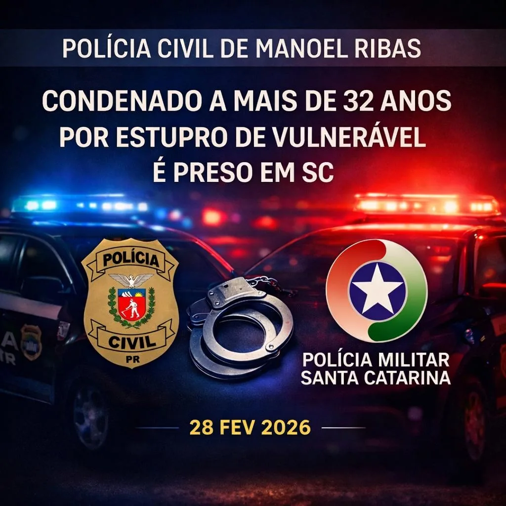 A Polícia Civil do Paraná, por meio da Delegacia de Polícia de Manoel Ribas, prendeu na manhã deste sábado (28/02) um homem condenado definitivamente pela Justiça da Comarca de Manoel Ribas a mais de 32 anos de reclusão pelo crime de estupro de vulnerável. A captura ocorreu no município de Joinville (SC), após trabalho investigativo que identificou o paradeiro do condenado fora do Estado.