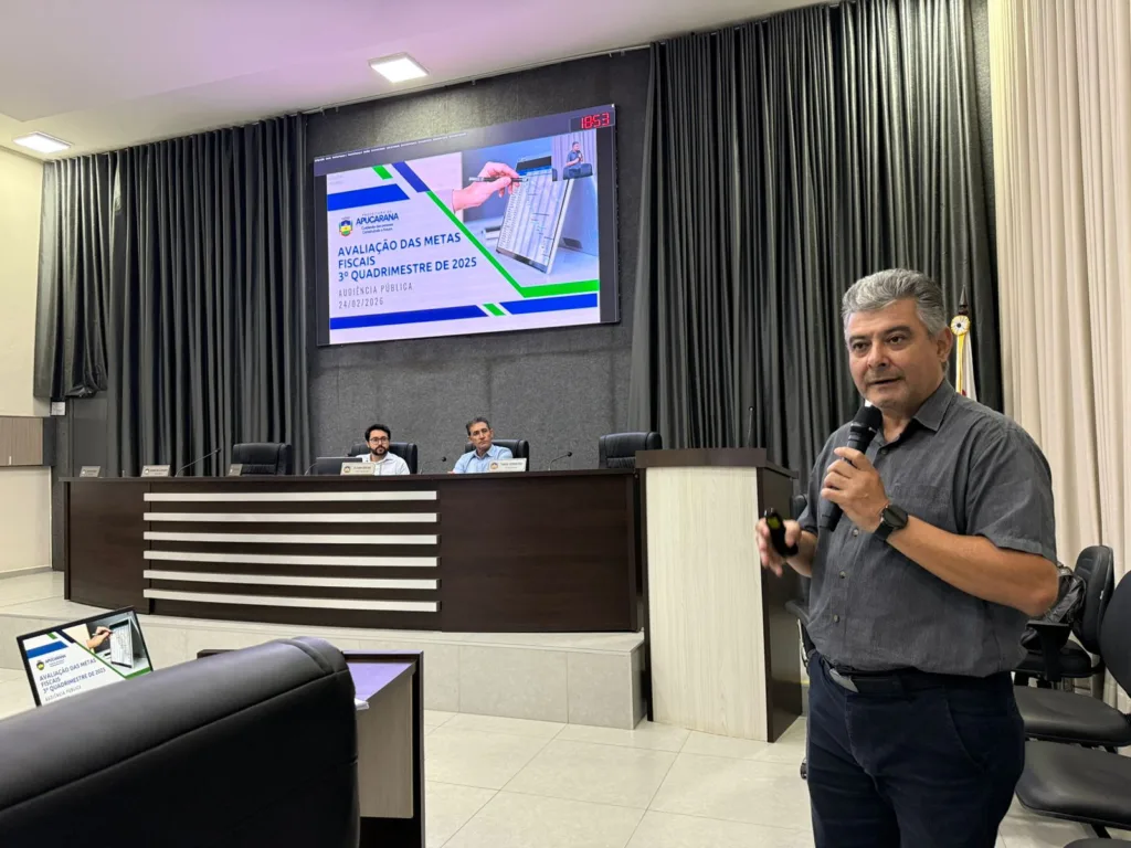A Prefeitura de Apucarana encerrou o exercício de 2025 superando os investimentos mínimos constitucionais em Educação e Saúde e mantendo as contas públicas equilibradas. Os dados foram apresentados nesta quarta-feira (24/02), no plenário da Câmara de Vereadores, durante audiência pública de prestação de contas do 3º quadrimestre (setembro a dezembro), com a presença do prefeito interino Marcos da Vila Reis e do vereador Moisés Tavares. Os trabalhos foram conduzidos pelo secretário municipal da Fazenda, professor Rogério Ribeiro.