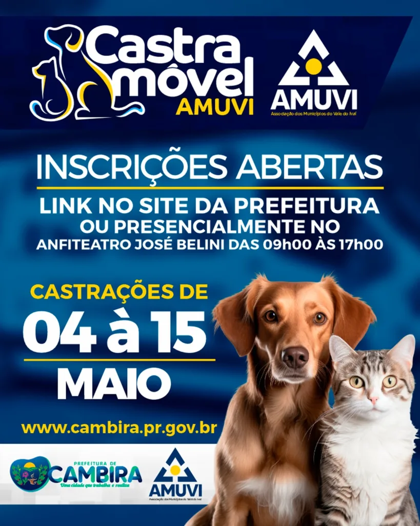 A Prefeitura de Cambira, em parceria com a AMUVI (Associação dos Municípios do Vale do Ivaí), está com inscrições abertas para mais uma etapa do programa Castra Móvel, que realizará castrações gratuitas de cães e gatos no município.