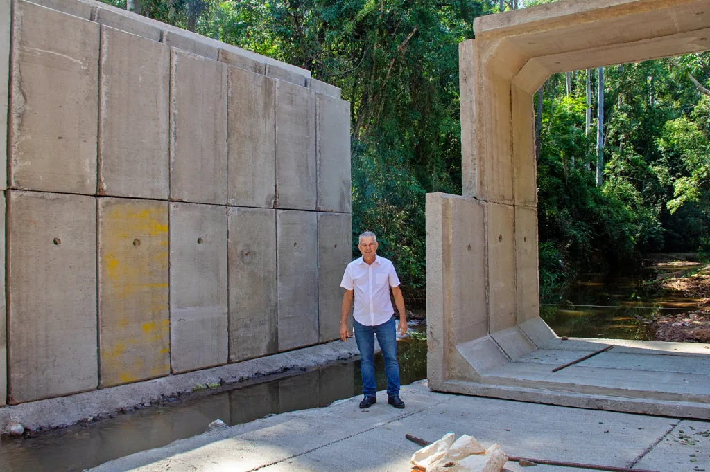 A antiga ponte de madeira foi destruída no ano passado após fortes chuvas que atingiram o município. Desde então, a administração municipal vinha trabalhando na elaboração do projeto, na busca de recursos e na realização dos trâmites necessários para a reconstrução da estrutura. Desta vez, a nova ponte, que era de madeira, está sendo construída em concreto, com estrutura reforçada, garantindo maior resistência ao grande volume de água registrado no local durante períodos de chuva intensa.
