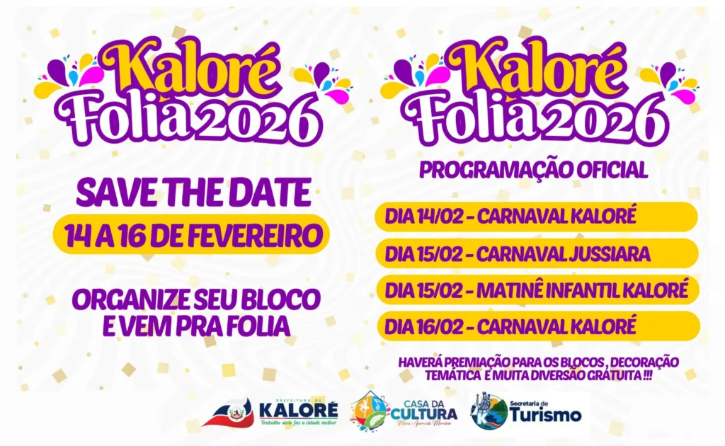 A Prefeitura de Kaloré divulgou a programação oficial do Kaloré Folia 2026, evento que promete movimentar o município e o distrito de Jussiara com muita música, cultura e lazer. A festa acontece entre os dias 14 e 16 de fevereiro, com atividades gratuitas voltadas para toda a família.