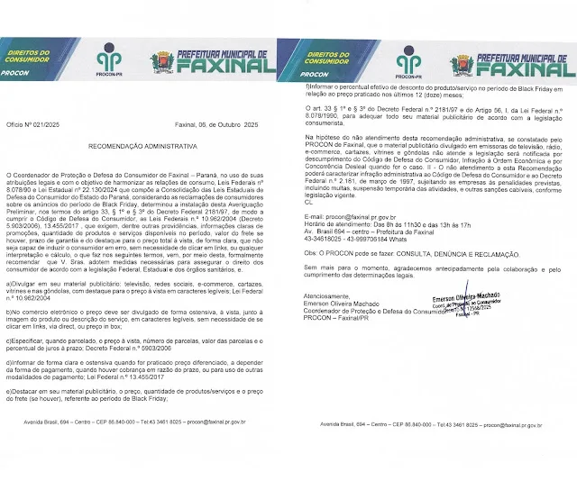 O Coordenador de Proteção e Defesa do Consumidor de Faxinal, Emerson Oliveira Machado, estará realizando a entrega do Ofício nº 021/2025, que contém uma recomendação administrativa aos estabelecimentos comerciais do município sobre as práticas de divulgação e venda durante o período da Black Friday. O documento tem como objetivo harmonizar as relações de consumo e garantir transparência nas ofertas, conforme o Código de Defesa do Consumidor e as legislações federal e estadual vigentes. A recomendação orienta que os lojistas informem de forma clara os preços, descontos, formas de pagamento e condições promocionais, tanto em anúncios físicos quanto em plataformas digitais. Segundo o coordenador Emerson Machado, o Procon está atento às práticas de publicidade e reforça que o descumprimento das normas pode gerar infrações administrativas, multas e outras penalidades. Ele explicou que o papel do órgão é orientar e prevenir. “Queremos que o comércio local tenha boas vendas, mas sempre respeitando o direito do consumidor”, afirmou. A ação faz parte das medidas preventivas do Procon de Faxinal para evitar propagandas enganosas e garantir um comércio justo durante a Black Friday 2025.