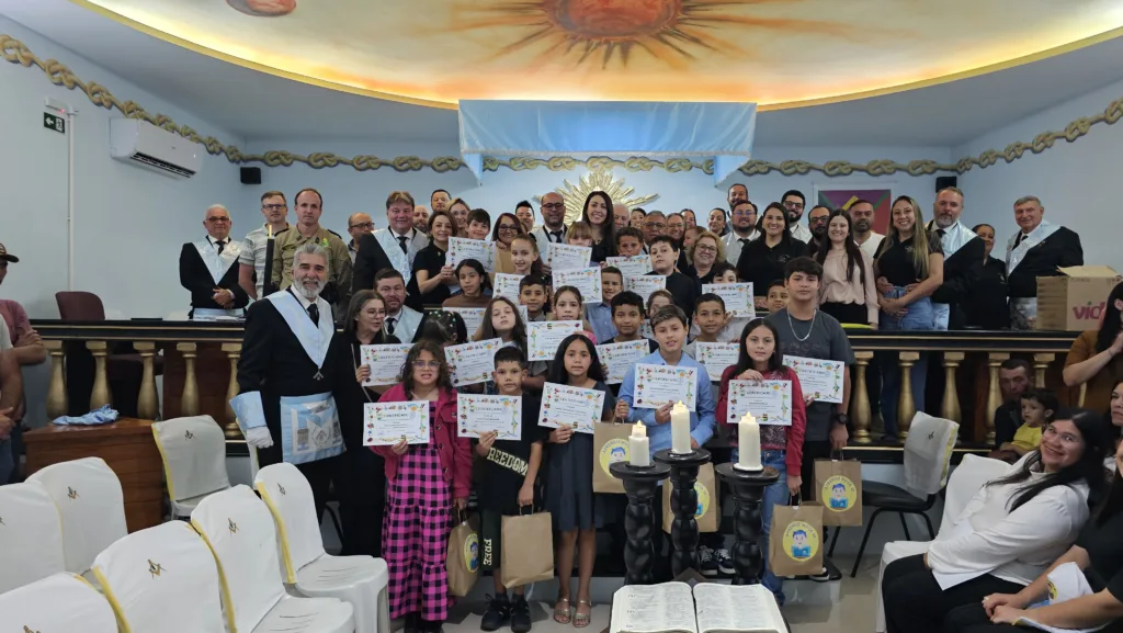“Aprendiz Nota 10”, uma iniciativa da Loja Maçônica XIII de Maio que, ano após ano, se destaca pela seriedade, alcance social e capacidade de transformar o ambiente escolar. O encerramento aconteceu em sessão pública no templo da Loja, sob condução do Venerável Mestre Alessandro Antônio Belonci, que também comanda o Posto da Polícia Rodoviária de Ubá do Sul, em Lidianópolis. O projeto, iniciado em 2018, começou modestamente em uma escola, mas rapidamente ganhou força. Com apoio da Secretaria Municipal de Educação, chegava, em 2019, a quatro escolas. Em 2025, alcançou todas as escolas públicas municipais, envolvendo mais de 1.000 crianças ao longo do ano letivo. Na edição atual, 24 alunos foram premiados, simbolizando o esforço coletivo entre educadores, alunos, famílias e membros da Loja Maçônica. O “Aprendiz Nota 10” atua sobre 12 qualidades fundamentais para a formação cidadã: pontualidade, leitura mensal, respeito mútuo, higiene, organização, disciplina, afetividade, participação nos eventos da escola, liderança positiva, envolvimento da família e compromisso com a aprendizagem. Pais e responsáveis também são parte importante da iniciativa, reforçando que a educação começa dentro de casa. As ferramentas de avaliação são aplicadas trimestralmente pelos professores, que enviam as planilhas à Loja. A partir desse acompanhamento, são identificados os estudantes que mais se destacaram no ano.