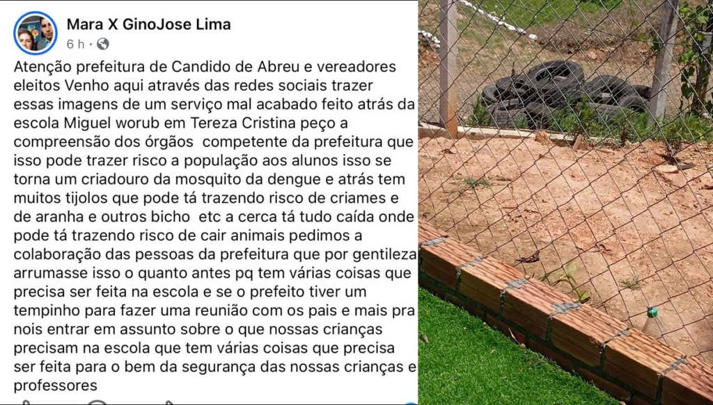 Moradores do distrito de Tereza Cristina, em Cândido de Abreu, a cerca de 50 quilômetros do centro do município, usaram as redes sociais para denunciar a situação precária do entorno da Escola Municipal do Campo Tereza Cristina, antiga Escola Miguel Worub. A postagem, está no perfil: Mara X Gino Jose Lima, mostra pneus acumulados, entulhos, tijolos soltos e parte da cerca caída nos fundos da unidade, cenário que tem preocupado pais e funcionários.