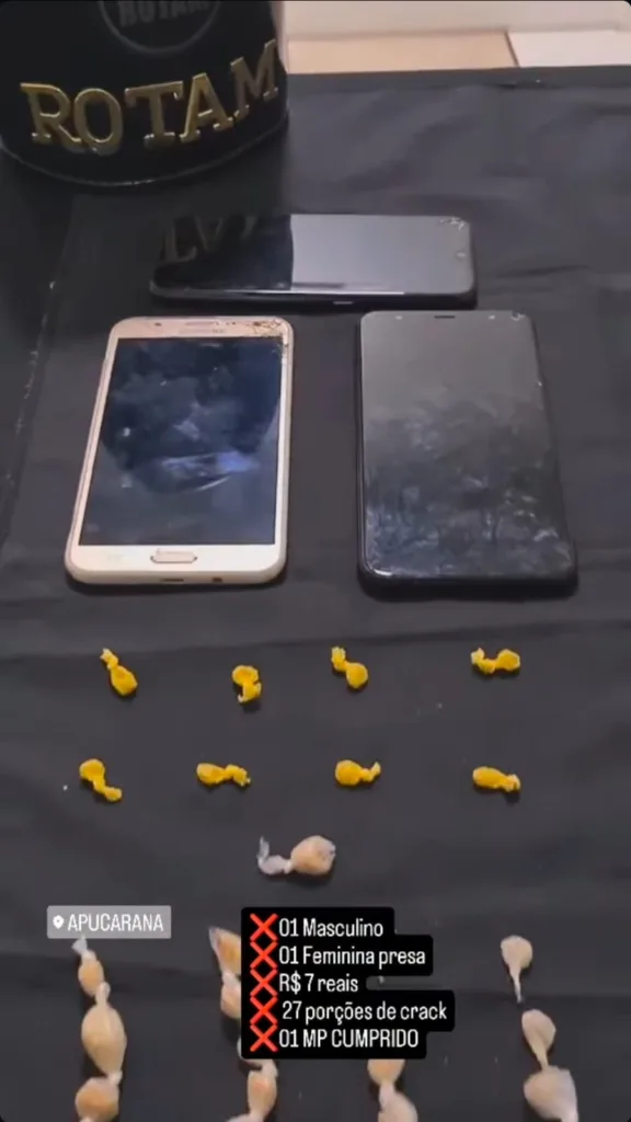 Com a mulher, foram encontradas porções de crack na bolsa e em suas roupas íntimas. Ela relatou ter adquirido a droga com o outro abordado. Durante a revista no homem, ele expeliu diversas pedras de crack que mantinha na boca. A polícia constatou ainda que o suspeito era evadido do sistema prisional e portava dinheiro em notas trocadas.