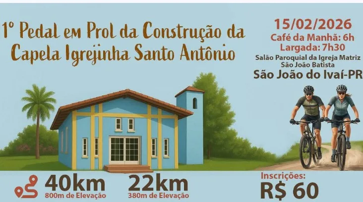 São João do Ivaí vai sediar, no dia 15 de fevereiro de 2026, o 1º Pedal em Prol da Construção da Capela Igrejinha Santo Antônio, na comunidade Água do Macaco. O evento une esporte, lazer, contato com a natureza e solidariedade, com toda a renda revertida para a obra da capela.